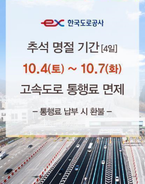 2025년 추석은 10월 4일부터 7일까지 무료 통행이 적용되었습니다.