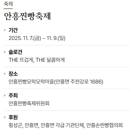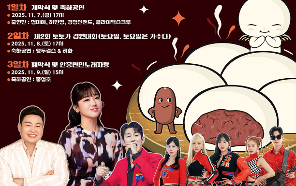 올해는 초청가수 무대와 찐빵 체험, 지역 농특산물 판매까지 함께 진행될 예정입니다. 지금부터 일정표, 초청가수 정보, 주차장 이용방법을 순서대로 확인하실 수 있습니다.