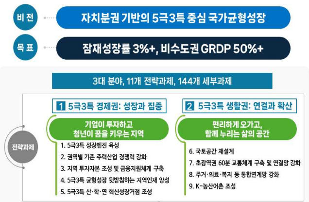 5극3특은 권역별 성장엔진과 전략산업을 통해 지역의 실질적인 경쟁력을 높이는 방식으로 추진됩니다.