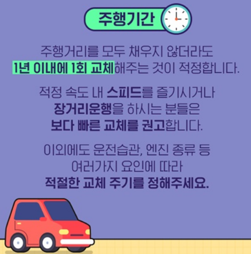 자동차 제조사는 차종별로 엔진 구조와 성능에 맞춘 교환주기를 제시하고 있습니다.