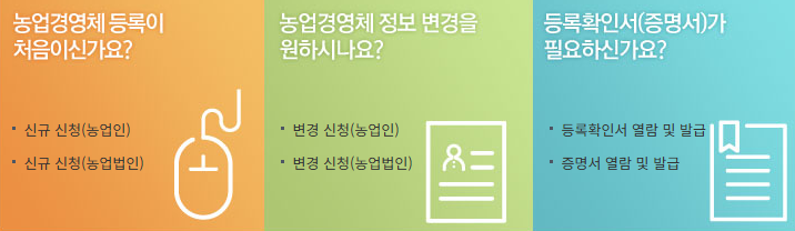 농업경영체 변경 등록은 온라인 또는 관할 기관을 통해 신청할 수 있습니다.