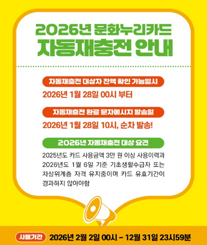 문화누리카드 자동충전은 전년도 사용 이력과 수급 자격을 유지한 대상자에게 적용됩니다.