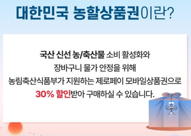 농할상품권은 보통 정가 대비 약 30퍼센트 선할인 구조로 판매됩니다.
